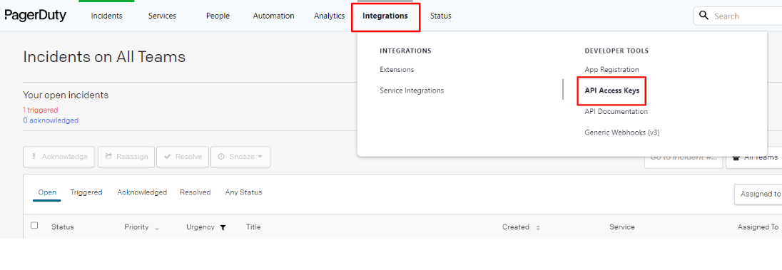 - PagerDutyの管理画面にアクセスし、[Integrations] > [API Access Keys]をクリックします。