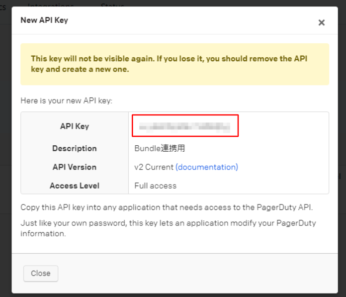 - 作成した「API Key」をコピーし、Bundleの連携画面「API Key」に貼り付けます。
