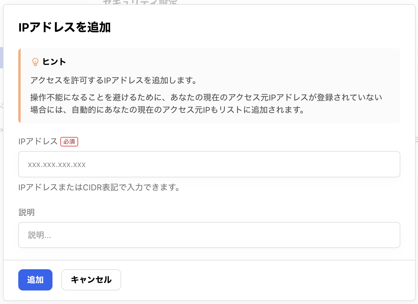 [ヒント]に記載の通り、操作不能になることを避けるため、操作ユーザーの現在のアクセス元IPアドレスが登録されていない場合には、自動的に現在のアクセス元IPもリストに追加されます。