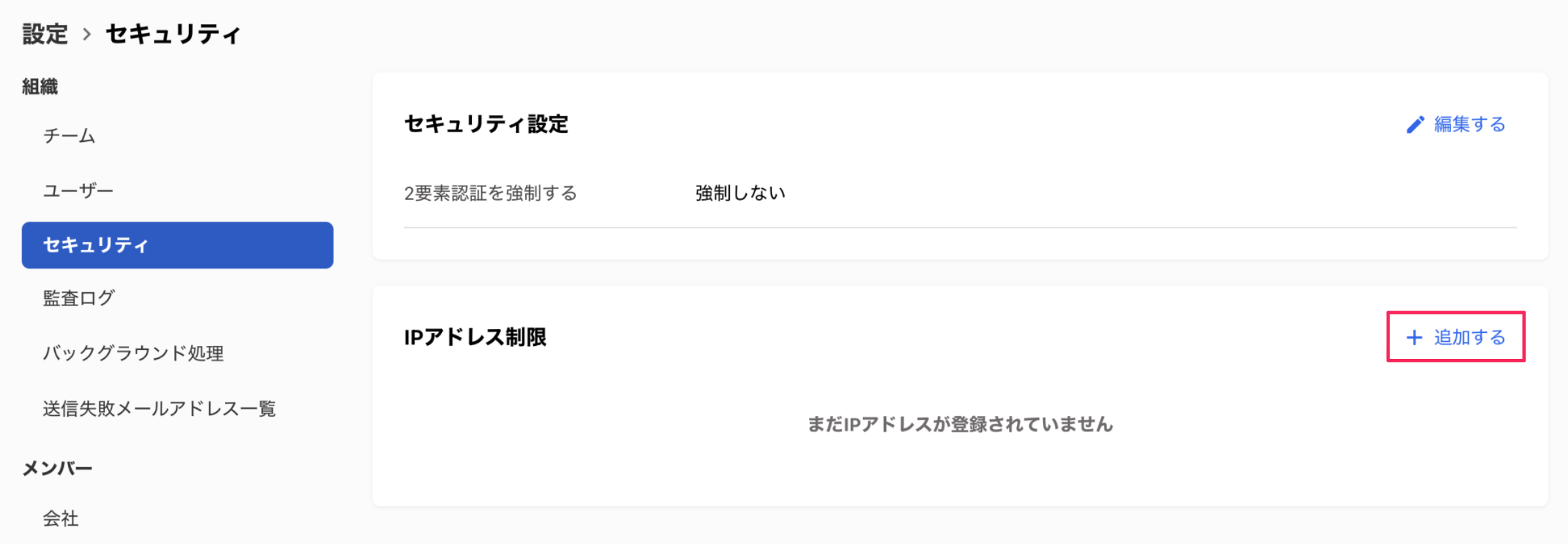 - [設定]>[組織]配下の[セキュリティ]>[IPアドレス制限]>[追加する]をクリックします。