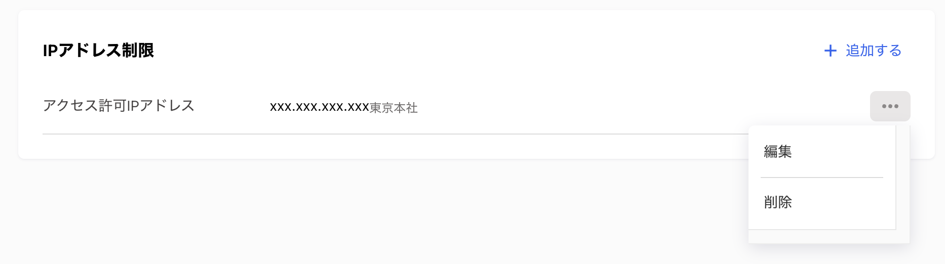 追加したIPアドレスの[編集]および[削除]は各IPアドレスの三点リーダーから実行可能です。
