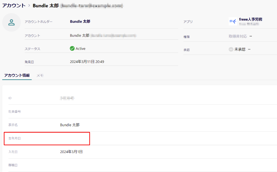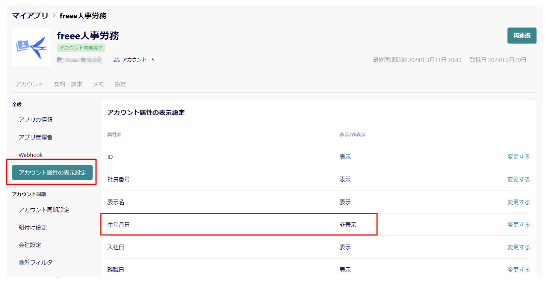 [変更する]ボタンをクリックし、[非表示]に変更すると、アカウント詳細画面において、Bundle管理者が見る必要のない情報(従業員の生年月日や退職理由など)を非表示にすることができます。