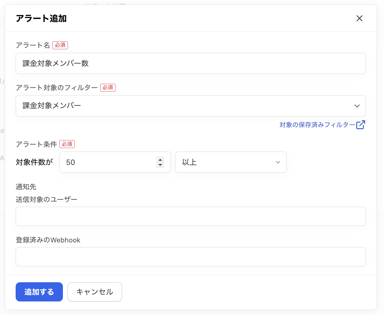 アラート活用例 Bundle by freee ヘルプページ 2025年08月28日 02:35 更新 課金対象のメンバー数が「XXX」を超えたら通知する保存済みフィルターの作成[メンバー]>[フィルター]をクリックし、[在籍ステータス]の「在職中」と「休職中」にチェックを入れ、「課金対象メンバー」を絞り込むフィルターを作成し、保存します。フィルター条件を保存する アラートの作成上記で作成したフィルターを対象としたアラートを作成し、任意のアラート条件 / 通知先を設定し、[追加する]をクリックします。 アラートとは アラートを作成する Bundleの課金対象IDや契約内容については以下をご確認ください。 [料金・契約]Bundleの課金対象ID数を確認したい [料金・契約]Bundleの契約内容/請求履歴を確認したい 関連記事 アラートとは アラートを作成する [料金・契約]Bundleの課金対象ID数を確認したい アラート通知をミュートする アプリ連携ができない際の解決方法