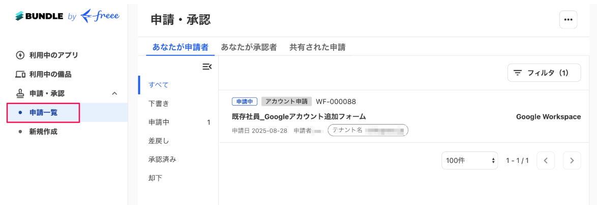 [申請一覧]にて、自身が作成した申請や共有された申請等を確認できます。