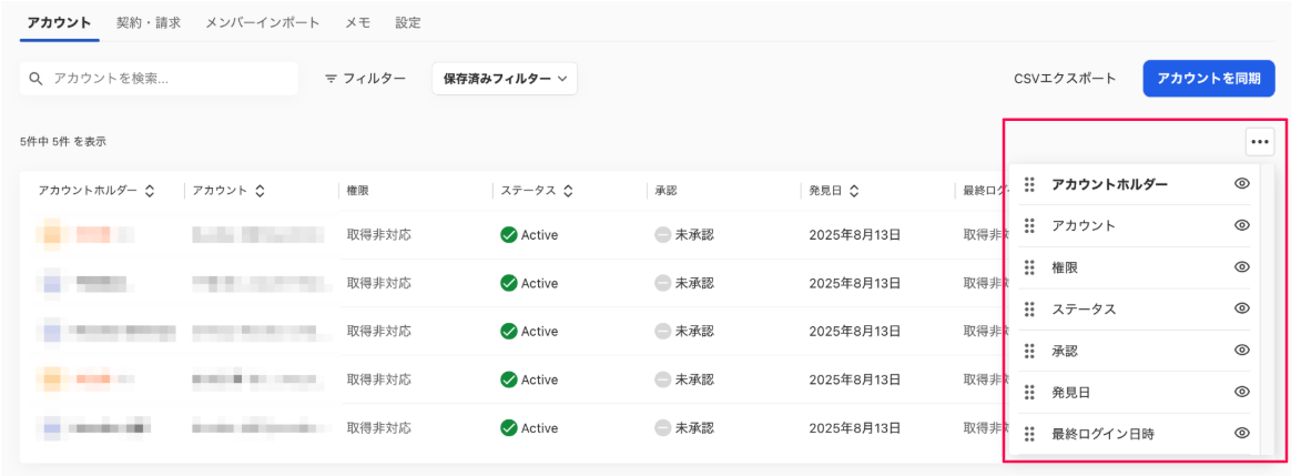 詳細は[共通]アカウント一覧画面をカスタマイズするをご確認ください。