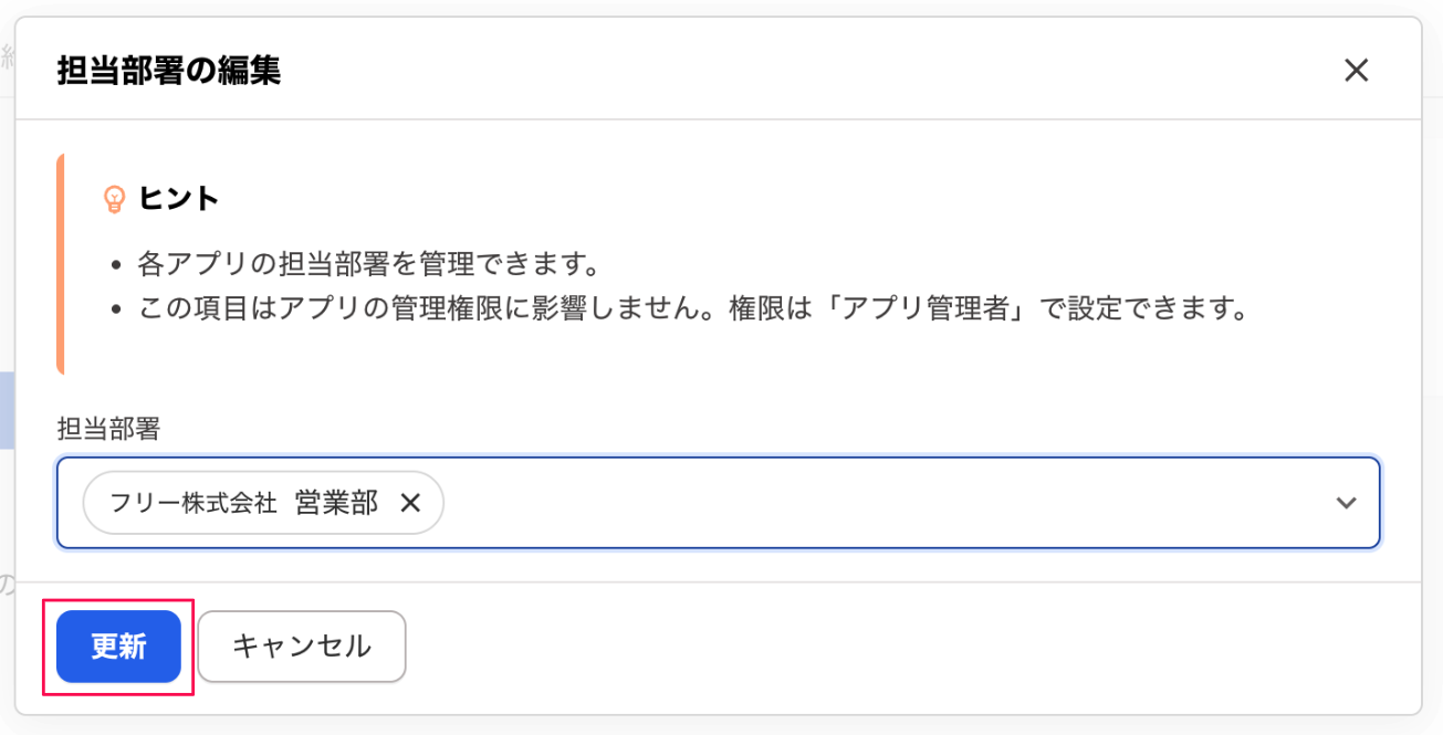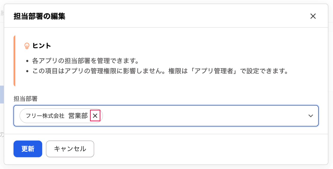 - 既存の担当部署を変更したい場合、[✖︎]ボタンを押して一度部署の選択を解除し、新たに設定したい部署を選択して[更新]をクリックします。