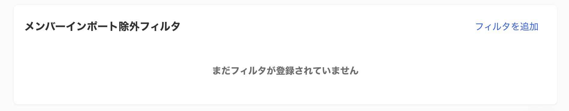 マイアプリの[設定]>[メンバーインポート]>[メンバーインポート除外フィルタ]から特定条件に合致するアカウントをメンバーインポート対象から除外するフィルタを設定できます。