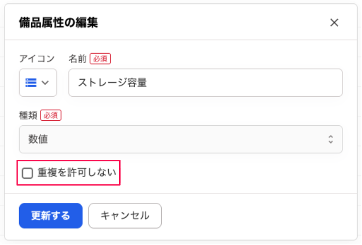 [重複を許可しない]にチェックを入れることで対象属性の備品間での重複を許可しない設定が可能になりました。