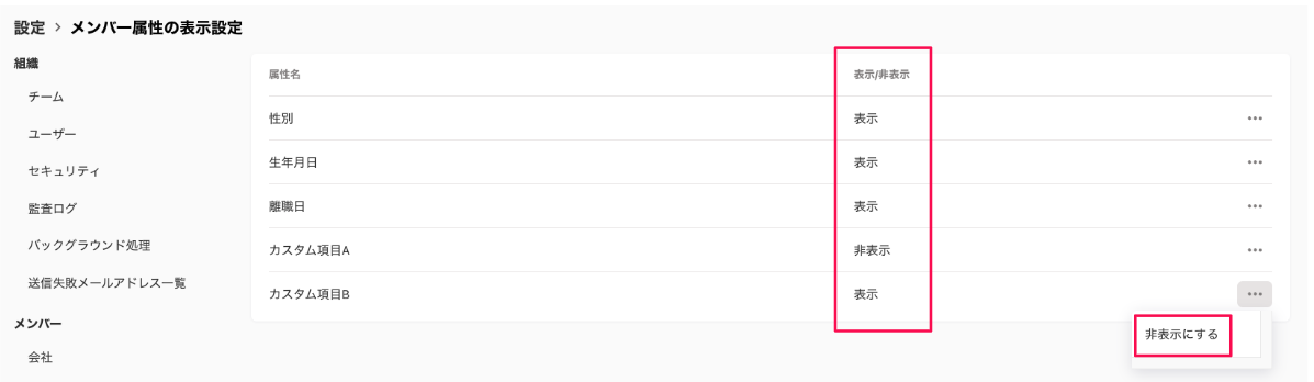 メンバー属性の表示 / 非表示を設定する Bundle by freee ヘルプページ 2025年11月28日 02:44 更新 [設定]>[メンバー属性の表示設定]からメンバープロフィールにおけるメンバー属性の表示 / 非表示制御が可能です。現在は以下メンバー属性が制御できます。性別生年月日離職日カスタム項目 非表示に設定した属性はメンバーのプロフィール画面上から項目ごと見えなくなります。※ 「メンバー一覧画面」および「メンバー情報のエクスポートCSV」内のカラムとしては引き続き表示されます(設定された値は非表示) 「性別」と「生年月日」を非表示 「性別」と「生年月日」を表示 関連記事 [マイアプリ]CSVエクスポートフォーマットをカスタマイズする 2025.11.26 リリース 2025.11.19 リリース 2025.10.29 リリース ユーザーを管理する