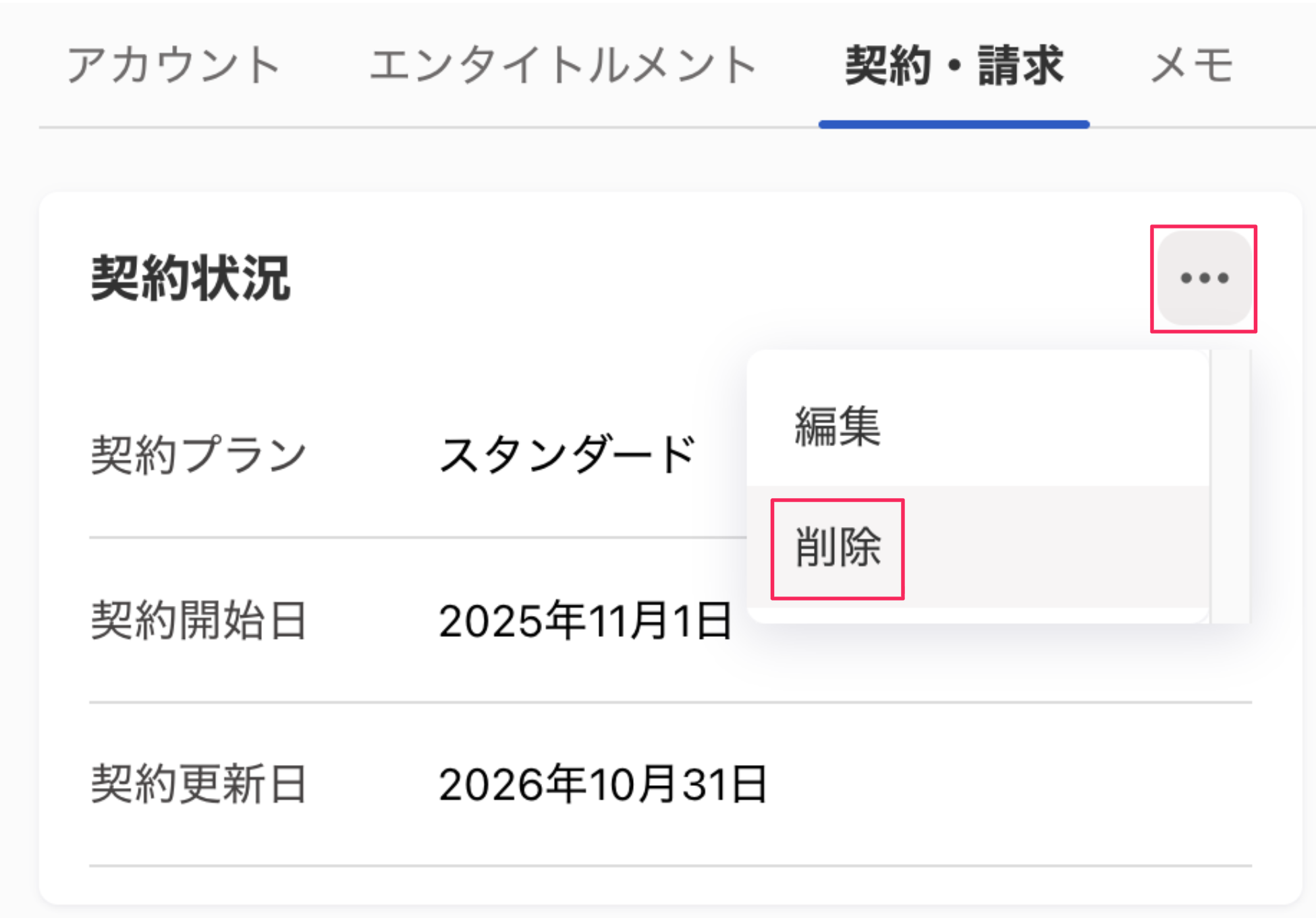 これまで、契約状況としてなんらかのデータを登録すると未登録の状態には戻せない仕様となっていましたが、本リリースにより不要な登録情報を三点リーダー >[削除]から削除可能になりました。