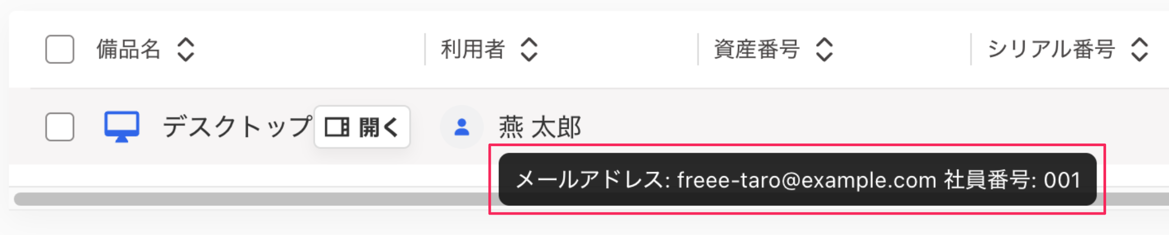 「利用者」部分にマウスカーソルを合わせることで利用者の「メールアドレス」および「社員番号」が表示されるようになりました。