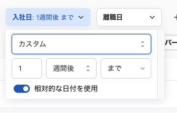 詳細な設定方法については、こちらの[フィルター]今日を基準に「〇日前」や「〇日後」といった条件で設定するにはどうすればいいですか?をご確認ください。