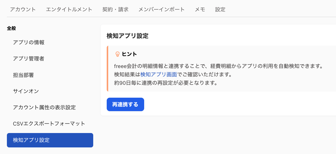- 約90日ごとに連携の再設定が必要となります。再連携が必要な場合は、同じ手順で[再連携する]ボタンをクリックしてください。