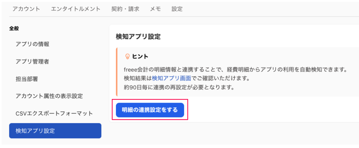 - [マイアプリ]> freee会計 >[設定]>[検知アプリ設定]>[明細の連携設定をする]をクリックします。