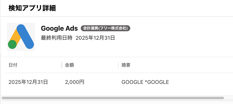 検知されたアプリの詳細画面では「日付」「金額」「摘要」が確認可能です。
