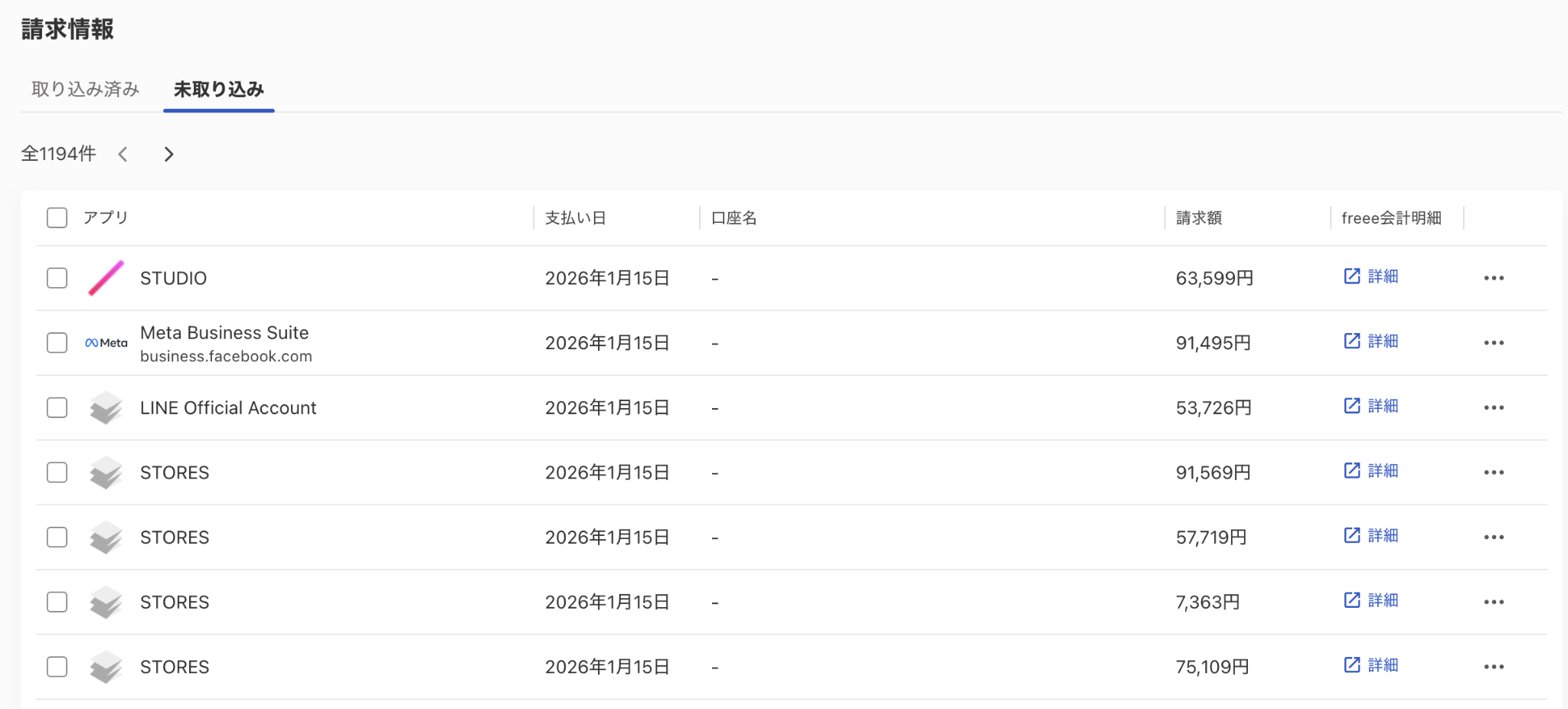 AIが摘要からSaaSサービス名を予測し、[請求情報]>[未取り込み]タブに請求情報が表示されます。